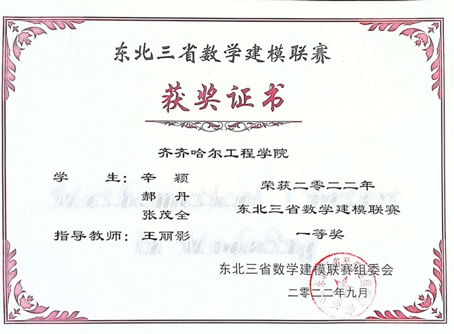 近日,2022年东北三省数学建模联赛结果揭晓,伟德官网三个学生团队分获一、二、三奖。 奖团队队员 指导教师 获奖等级 辛颖 郝丹 张茂全 王丽影 一等奖 耿...