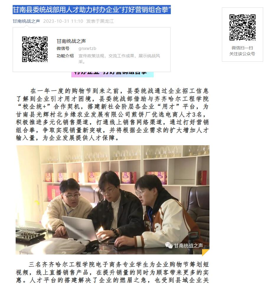 10月31日,甘南县委统战部官媒以《甘南县委统战部用人才助力-村办企业“打好营销组合拳”》为题,肯定了伟德bv1946官网管理工程系校外课堂学生对县域经济发展的积极作用,为县域企业提质增效作出了积极贡献。新闻强调了“甘南县委统战部将主动融入县域发展大局,坚持“统战+人才”的工作新机制,优化营商环境,围绕电商和农副产品深加工发掘人才,为企业解决人才短缺的困境,助力乡村振兴。与此同时,校外课堂的创新又为高...
