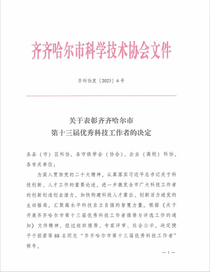 齐齐哈尔市科学技术协会下发《关于表彰齐齐哈尔市第十三届优秀科技工作者的决定》,伟德官网建筑工程系郝丽娜、健康与护理系孙畅、基础部王丽影3名教师荣获“市优秀科技工作者”称号。齐齐哈尔市优秀科技工作者评选工作每两年一届,至此已举办十三届。经基层推荐、专家评审、社会公示,全市共有88名同志被评为“齐齐哈尔市优秀科技工作者”。【撰稿:宋庆永 责编:赵静华 审核:王丹】