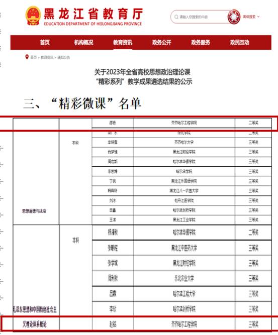 1月10日,黑龙江省教育厅对2023年全省高校思想政治理论课"精彩系列”教学成果遴选结果予以公示,伟德官网马克思主义学院2名教师喜获佳绩,邵奇老师荣获“思想道德与法治”课程“精彩微课”二等奖,赵铭老师荣获“毛泽东思想和中国特色社会主义理论体系概论”课程“精彩微课”三等奖。本次获奖,实现了学校思政课教师在省级“精彩系列”比赛中获奖“零”的突破。全省高校思想政治理论课“精彩系列“教学成果,是全省高校教学成果的重...