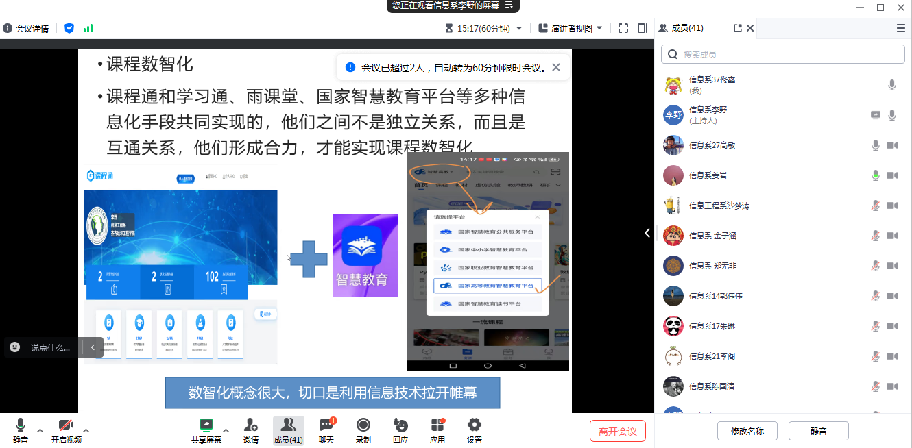 3月17日下午,信息工程系线上召开课程数智化建设研讨会议,本次会议由系教学副主任李野主持,系任课教师及行政兼课人员全体参加。 本次会议旨在探讨为什么要进行课堂数智化?课堂数智化做什么?怎么做?外聘教师课堂如何进行数智化等问题。李野就数智化教学的必要性进行了深入阐述。她表示,随着科技的进步,数智化教学已成为教育发展的必然趋势。数智化教学平台不仅能提高教学效率,还能更好地满足学生的学习需求,有助于落实...