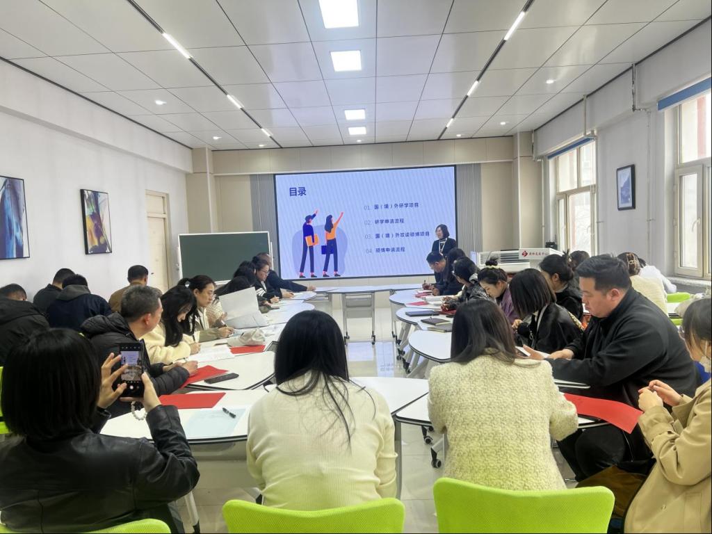 为进一步提升辅导员及学生综合素养和专业技能,推进师生参与国际研学、攻读硕博学位项目,4月11日,学生工作处在二号教学区2102会议室组织开展第94期辅导员沙龙活动,邀请学校国际交流合作中心副处长赵丹丹作国际交流项目宣讲,学生工作处处长王丽萍、辅导员、学生工作处全体参加。赵丹丹对学校与国外交流合作现状、国外研学项目、攻读硕博学位的优势学科、特色课程、申请流程、奖学金政策等方面进行了详细介绍,通过生动案例和...