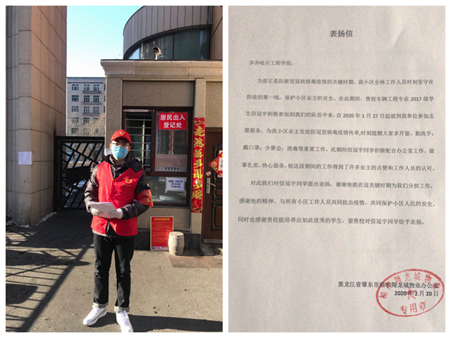 2月20日,机电工程系收到肇东市十七道街福和翔龙城物业办公室发来的表扬信,称赞车辆172班学生信冠宇协助小区工作人员共同抗击疫情,做事扎实、服务热心,得到居民点赞。 家住福和翔龙城的信冠宇同学,寒假在家得知新...