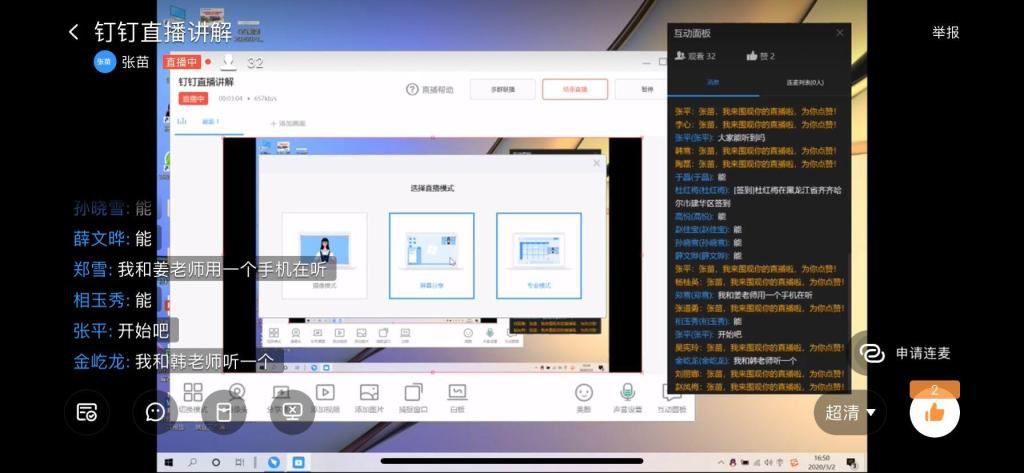 3月2日,健康与护理系利用钉钉软件平台召开第一天线上教学反馈会。 张苗老师以群直播的方式,向本系各位教师介绍了如何利用钉钉软件进行直播教学,重点介绍了群直播各种模式的优缺点、播放PPT和视频的技巧,以及如何...