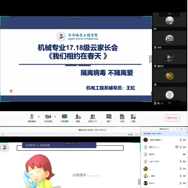 为加强疫情防控期间在线教学工作,促进家长、学生、学校之间的沟通,形成学生成长的教育合力,3月15日晚,机电工程系利用腾讯会议平台召开机械专业2017级、2018级学生云班会、云家长会。 学校副院长张振笋出席会议,...