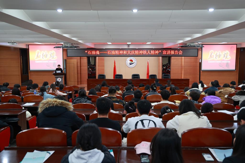 11月22日下午,学校党委在图书馆601报告厅开展“石油魂——石油精神和大庆精神铁人精神”宣讲报告会。特邀铁人王进喜纪念馆、全国红色旅游五好讲解员郑媛元主讲,学校各二级单位党组织书记、副书记、基层党支部书记、专职组织员、学生骨干等260人聆听讲座。宣讲报告会由党委宣传统战部部长助理王倩主持。郑媛元以《“石油魂”——石油精神和大庆精神铁人精神》为题,介绍了石油精神、大庆精神和铁人精神的形成和发展,讲述了...
