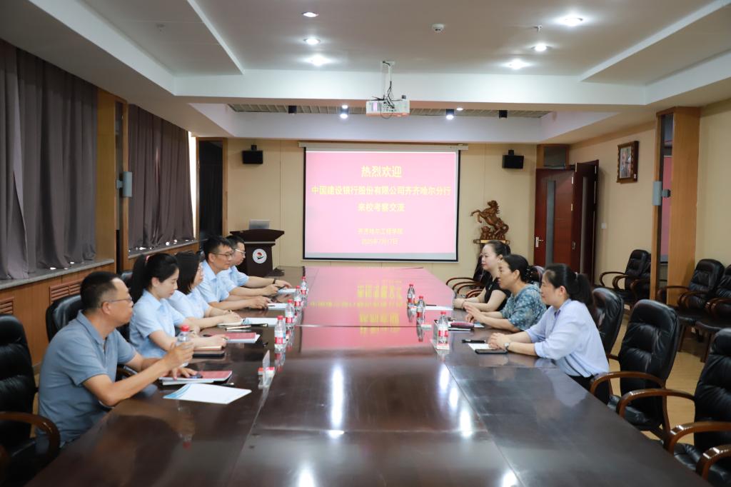 7月17日下午,中国建设银行股份有限公司齐齐哈尔分行副行长裴虹菲、普惠部副总经理李林、授信业务中心总经理修龙滨、机构业务部副总经理杨一桐、机构业务部客户经理刘红军一行5人来校考察交流,总会计师姜岩、财务处处长孙爱萍及相关人员接待并参加座谈。座谈会上,姜岩对裴虹菲一行表示欢迎,介绍了学校的发展历程、学校概况、基建项目,对东区校园的总体规划、北校区一期项目、昂昂溪校区、知甘堂的基本情况进行了说明,同时...